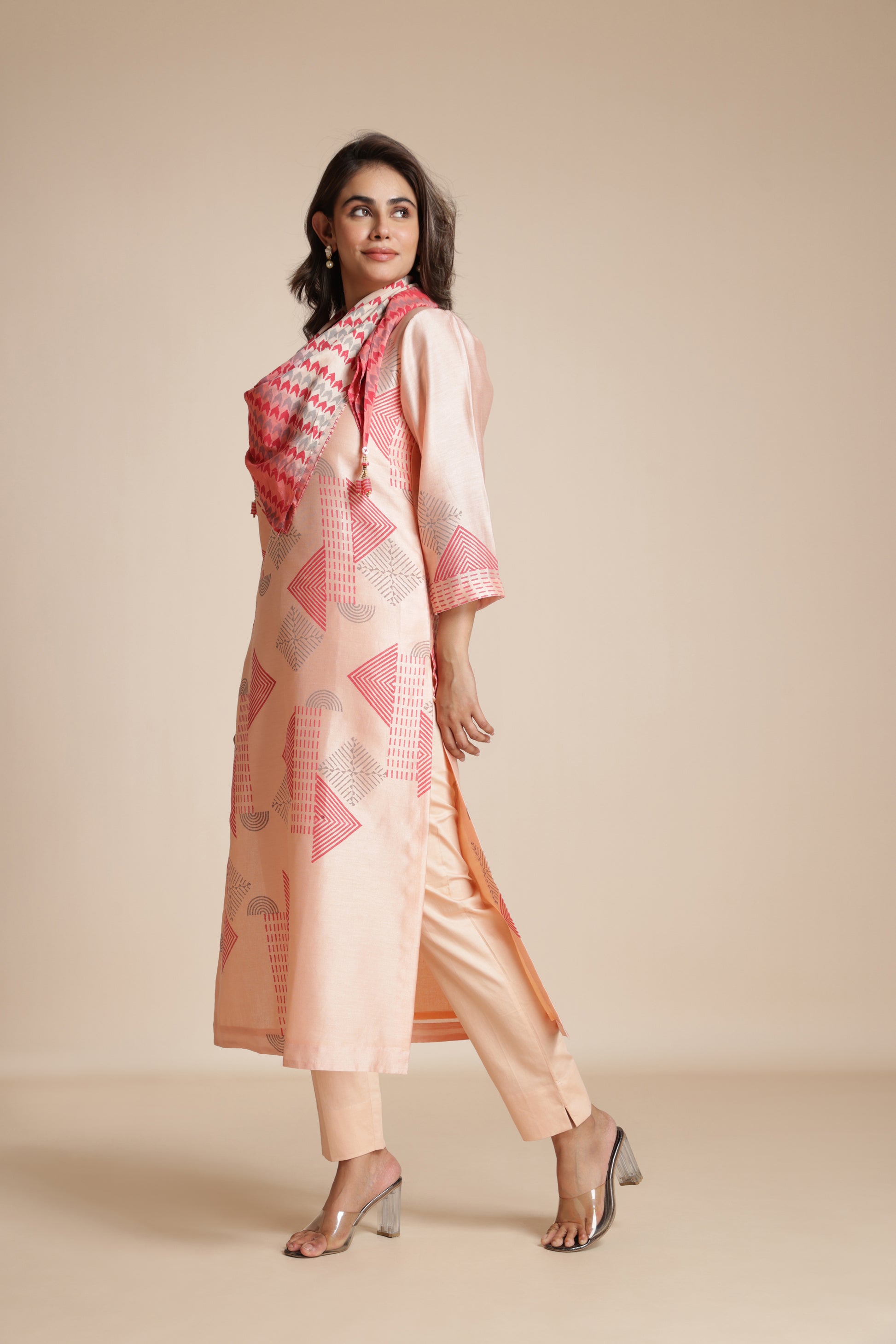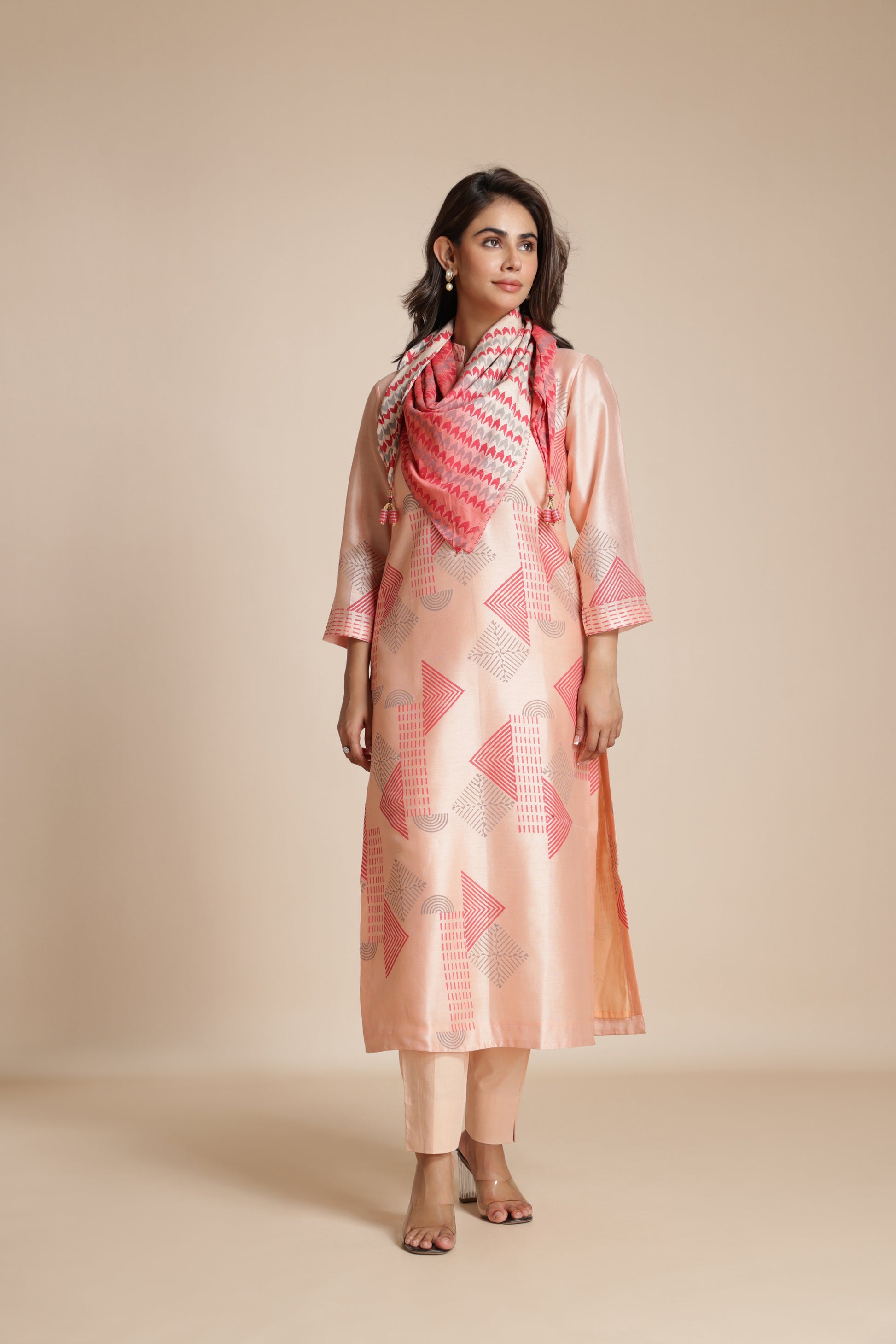 A sleek, straight-cut hand block-printed kurta featuring a modern geometric pattern